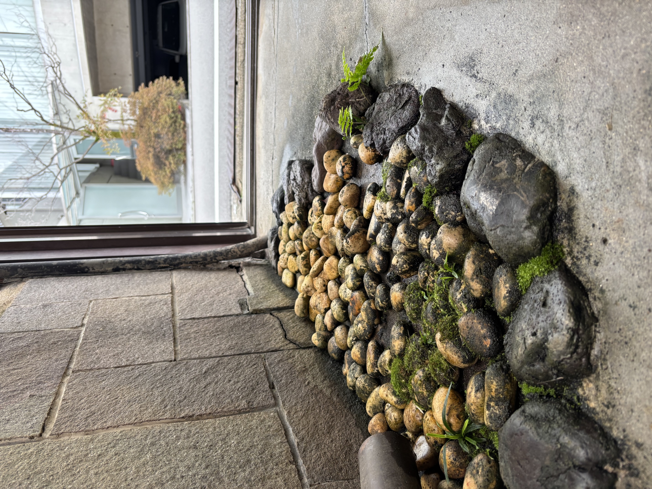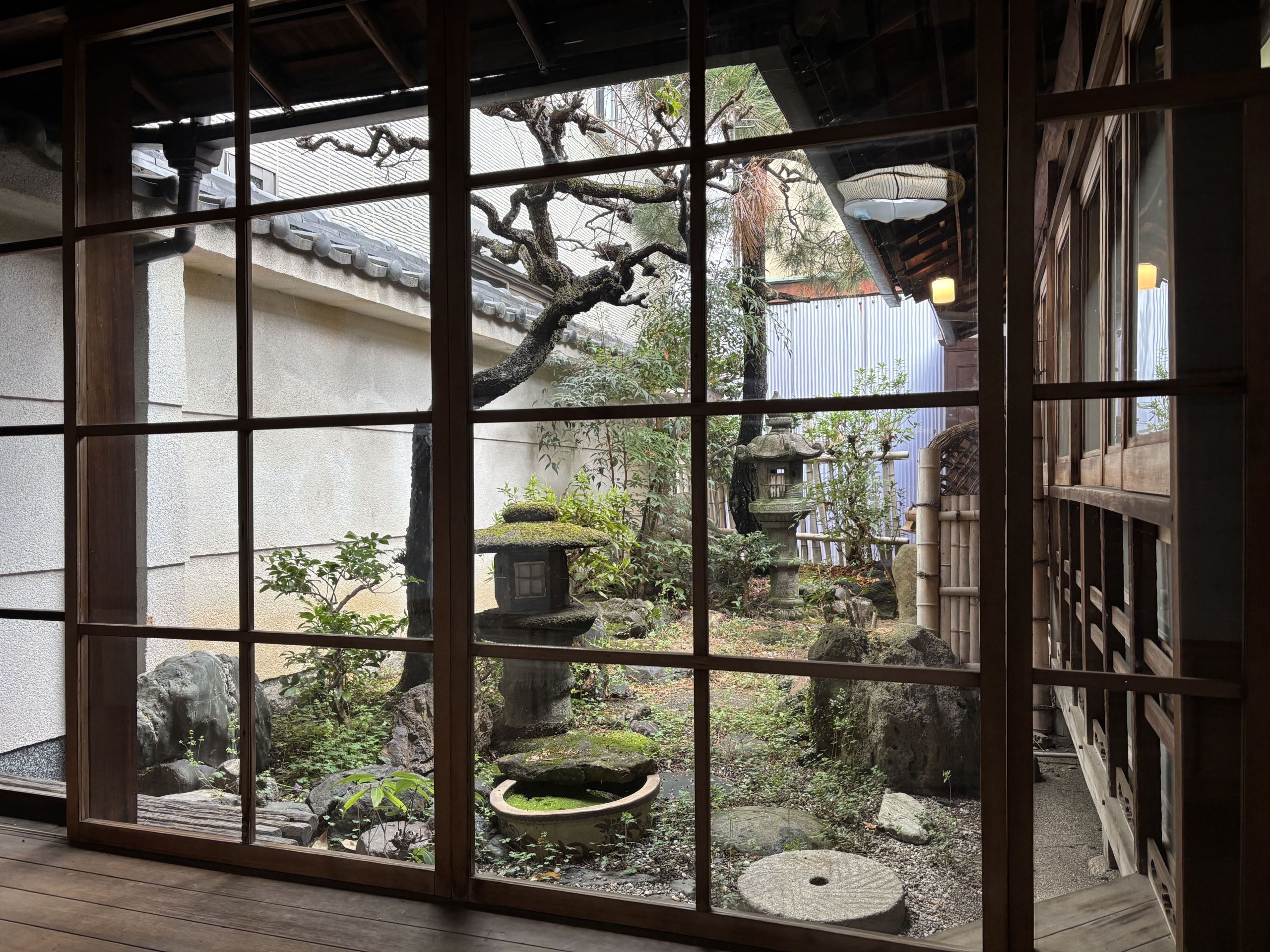 その先には伝統的な旅館を思わせる廊下があり、苔むした石庭を横切って洋風の別館へと続いている。.