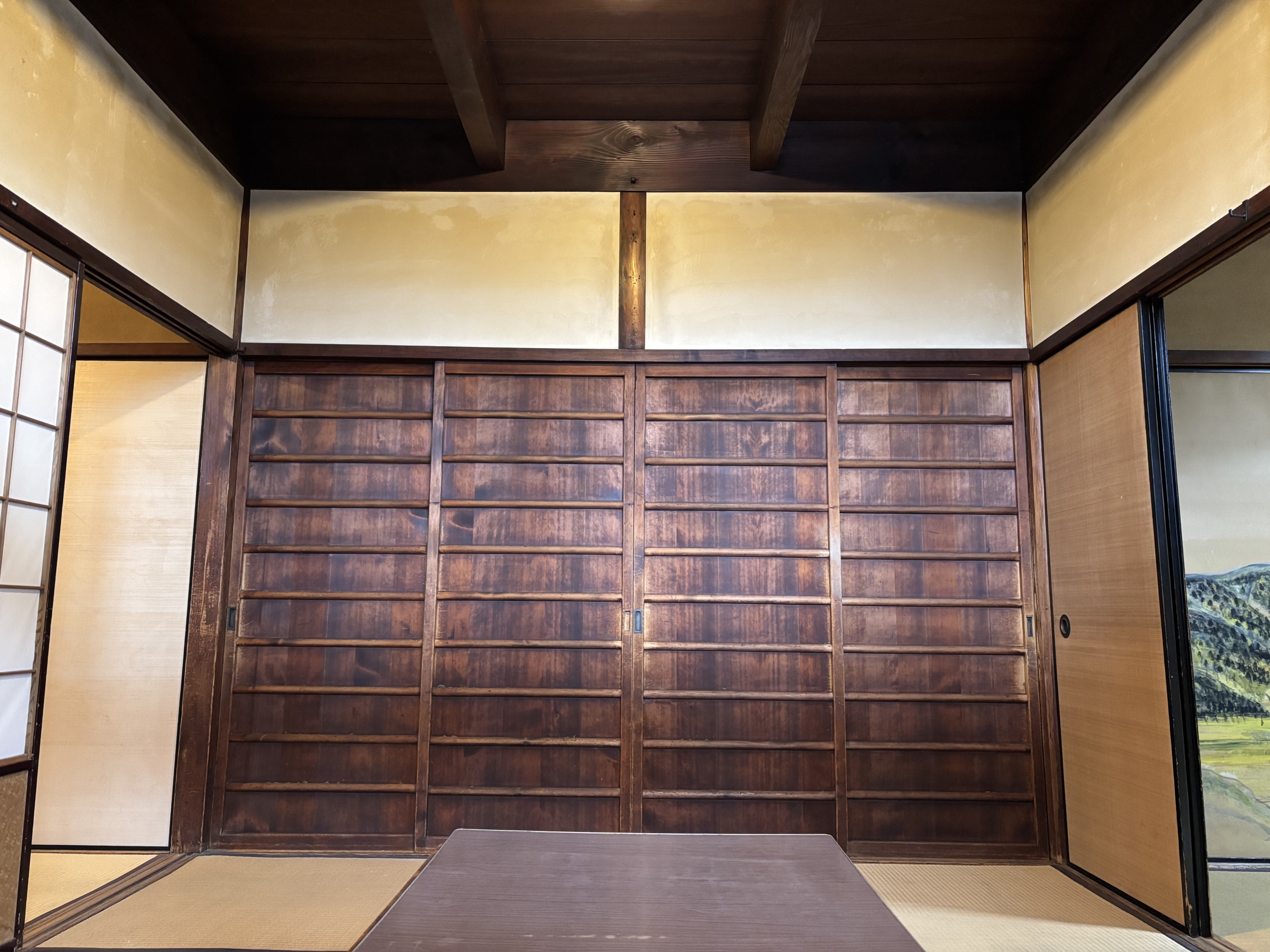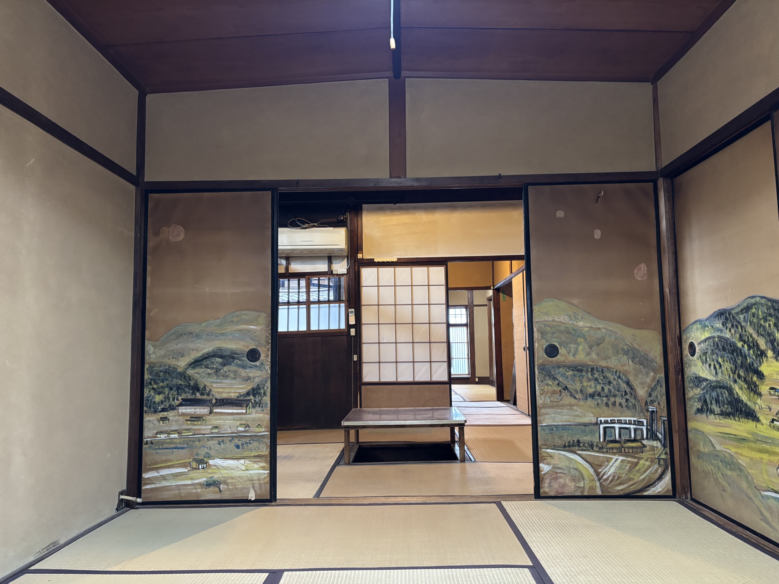 庭からの自然光に導かれながら奥に進むと、山の風景を描いたペイントの襖が外の緑と視覚的につながり、開放感と調和を生み出す和室にたどり着く。.