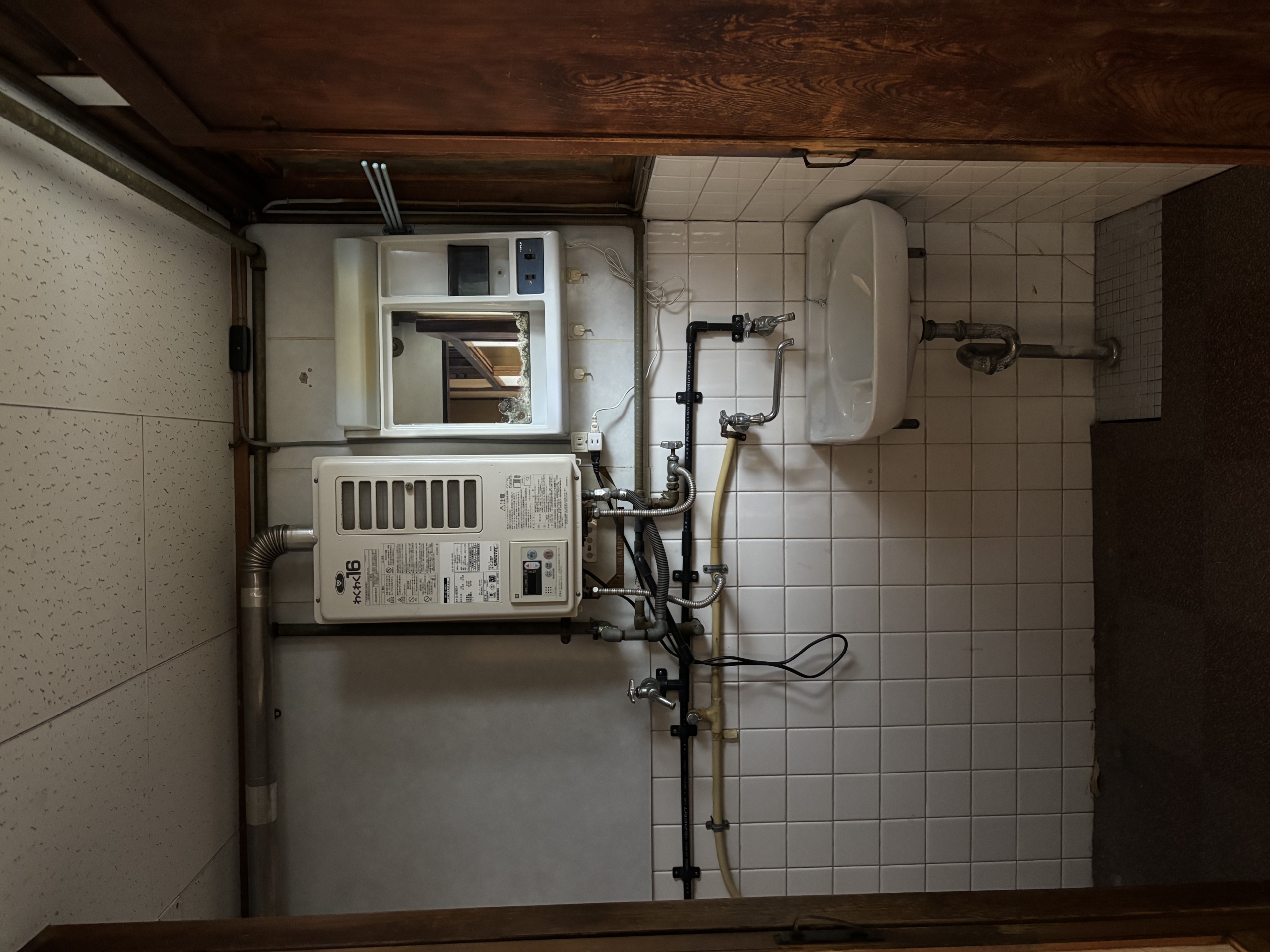 エンガワ(縁側)の中に置かれたレトロ調の小さなシンクは、静かな儀式の時間を誘う。.