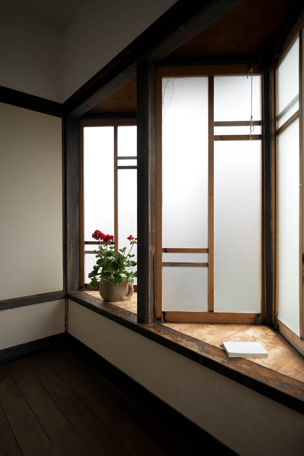 This unique machiya blends traditional Japanese architecture with playful Western influences, featuring charming bay windows and distinctive interior details such as an original tokobashira (alcove pillar). The design reflects a sense of character and individuality rarely found in standard townhouses.
