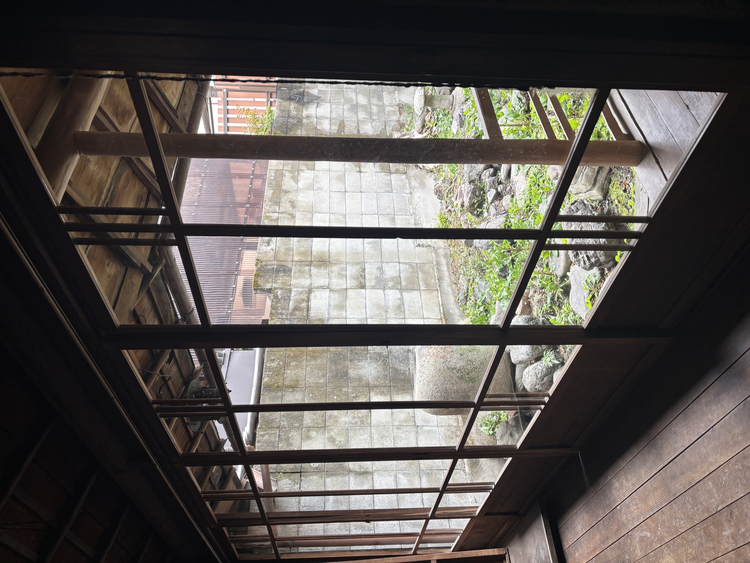The street in front of the property is pleasantly open, allowing natural light to gently illuminate the large wooden lattice façade of the machiya.