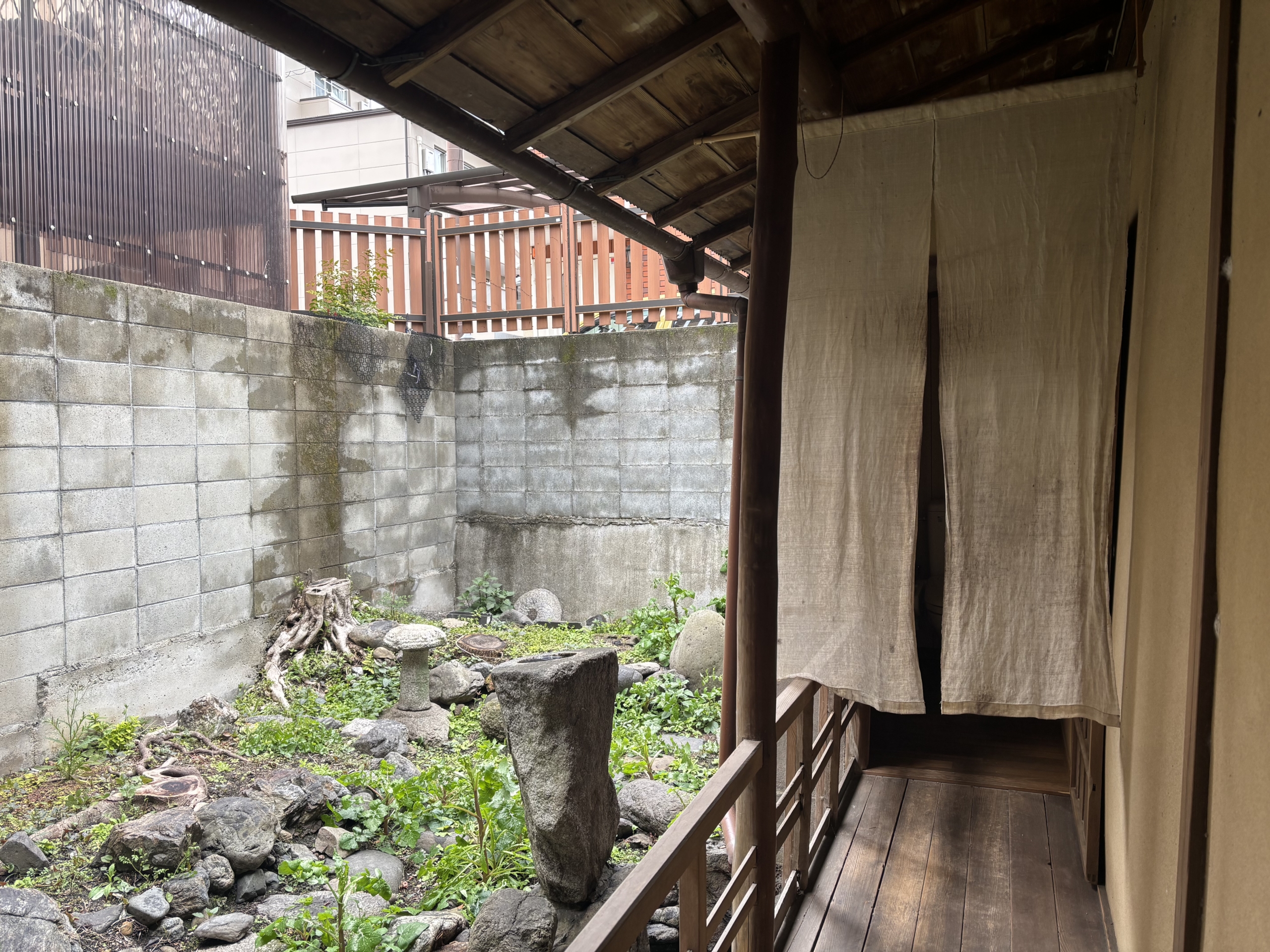 The garden features an engawa (wooden veranda), along with stepping stones and a stone water basin reminiscent of a tea garden, creating a serene and contemplative outdoor space.